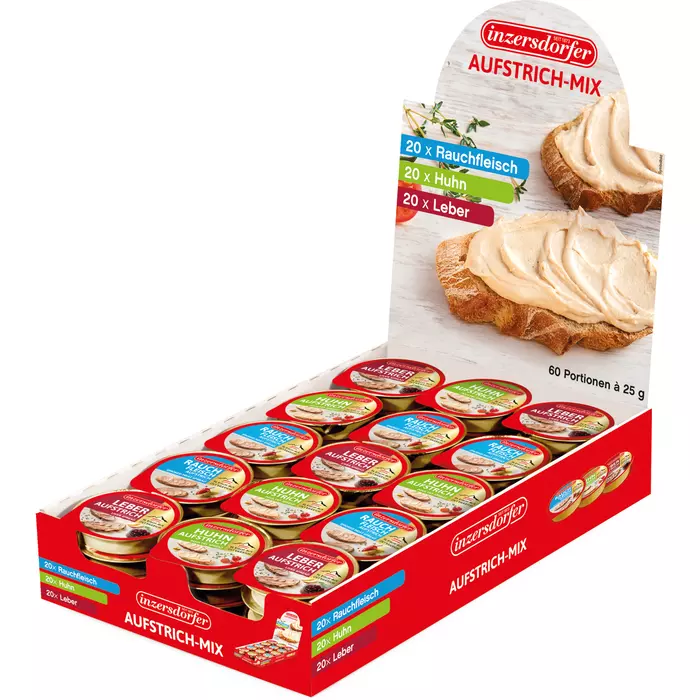 Zutaten: Rauchfleischaufstrich mit Milcheiweiß: Schweinefleisch (75%), Wasser, MILCHEIWEISS, Nitritpökelsalz (Speisesalz, Konservierungsstoff: Natriumnitrit), Röstzwiebel (Zwiebel, Palmöl, Buchweizenmehl, Speisesalz), Gewürze, Gewürzextrakte, Dextrose, Maltodextrin, Speisewürze (hydrolysiertes WEIZENPROTEIN, Speisesalz, Säuerungsmittel: Citronensäure) Antioxidationsmittel: Ascorbinsäure, Natriumascorbat, Natriumisoascorbat, Verdickungsmittel: Carrageen, Stabilisatoren: Diphosphate, Natriumcitrate, Raucharoma. Zutaten: Aufstrich mit Hühnerfleisch und Milcheiweiß: Hühnerfleisch (43%), Wasser, Sonnenblumenöl, Kokosöl, Zwiebel, MILCHEIWEISS, Emulgator: Mono- und Diglyceride von Speisefettsäuren, Glukosesirup, modifizierte Stärke, Speisesalz, Verdickungsmittel: Natrium-Carboxymethylcellulose, Speisewürze (Speisesalz, Eiweißhydrolysat aus Raps und Mais, Sonnenblumenöl), Gewürze, Antioxidationsmittel: Ascorbinsäure, Gewürzextrakte, Aroma, Dextrose, Zucker, Stabilisator: Diphosphate. Zutaten: Leberaufstrich: Schweinefleisch (48%), Wasser, Schweineleber (20%), Speck, Nitritpökelsalz (Speisesalz, Konservierungsstoff: Natriumnitrit), Gewürze, Gewürzextrakte, Dextrose, Speisewürze (hydrolisiertes Eiweiß aus Mais, Raps und Hefe), Maltodextrin, Geschmacksverstärker: Mononatriumglutamat, Antioxidationsmittel: Natriumascorbat, Natriumisoascorbat.